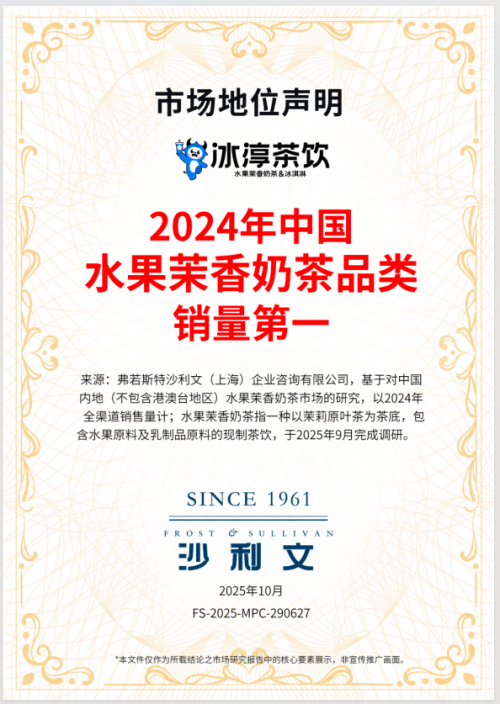 中国新锐茶饮品牌冰淳茶饮今日宣布,其已获得全球著名增长咨询公司弗若斯特沙利文的两项权威认证:“水果茉香奶茶品类销量第一” 与 “中国现制茶饮品牌门店覆盖海外国家数量第一” 。此次双认证的获得,标志着冰淳茶饮以“超级大单品”深耕核心市场的战略取得显著成效,同时其全球化布局也已跻身行业前沿。