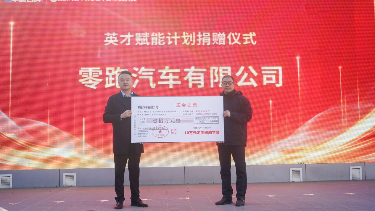 零跑汽车副总经理王业凯作为企业代表上台发言。王总表示昆明万通汽车学校以实操为核心的办学理念,与零跑“技术自研、实践为本”的发展基因高度契合。此次零跑汽车不仅带来10万元捐赠资金,更怀揣着深化校企合作的坚定决心——这笔资金将定向用于支持学校实训设备升级与技能竞赛培育,让同学们在校园就能接触到行业前沿的技术与标准。