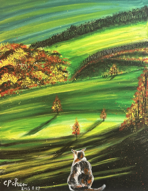 相比之下,陈持平以“等待”为主题的两幅作品,更具人文关怀与情感温度。在作品《我在盼望中等待你》中,一人一犬站在夕阳下的场景,充满生活的质朴感。人物与犬的形态以简练的线条勾勒,没有过多细节刻画,却传递出等待的焦灼与期盼。夕阳的余晖以温暖的橙黄色铺满画面,地面的影子被拉长,为画面增添了时间的纵深感。《我在未来中等待你》的猫与秋色,则展现出另一种宁静的等待。小猫的形态以圆润的线条勾勒,姿态慵懒地望向山下的绿野与树林。秋色的降临通过树木的金黄、棕色与绿野的绿色对比呈现,笔触既有厚重的堆积,也有轻盈的扫过。猫儿的凝望既是对山下世界的好奇,也是对未来的期许。这种细腻的情感表达,使作品超越了单纯的视觉呈现,是对生命状态的思考。