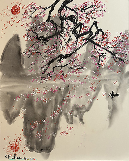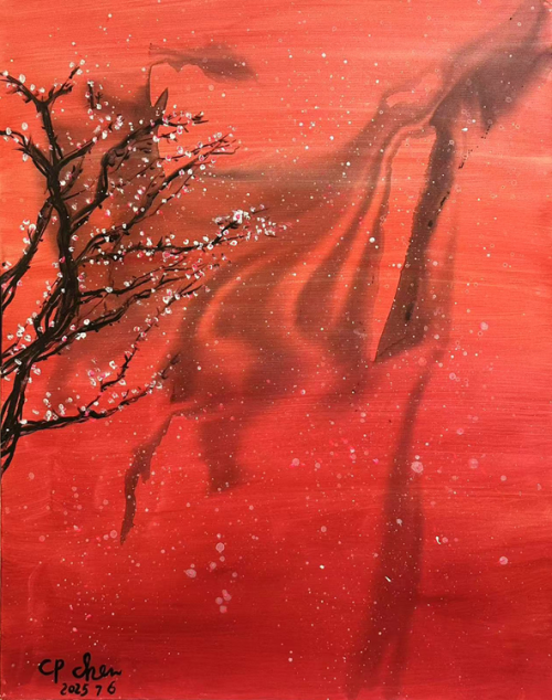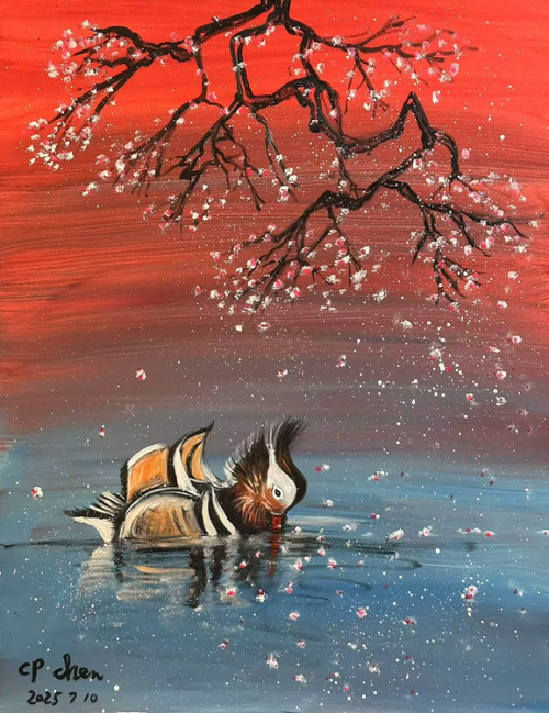 陈持平深厚的书法功底已经深深融入丙烯画的创作肌理。在他的笔触里,既有草书“笔走龙蛇”的灵动,如花瓣的纷扬、渔船的轻盈,又有篆书“力透纸背”的力度,如红霞的厚重、仙鹤的挺拔。这种“书画同源”的创作理念,使其作品在色彩的狂欢中不失笔墨的根基,在情感的宣泄中保持形式的美感。从落日红霞到桃花黄沙,从鸳鸯仙鹤到渔舟猫狗,陈持平笔下的每一个意象都承载着真挚的情感,每一幅作品都是对生命、时光、情感的思考与表达。他让传统笔墨在现代色彩中焕发新生,也让个人情感在视觉语言中引发普遍共鸣。