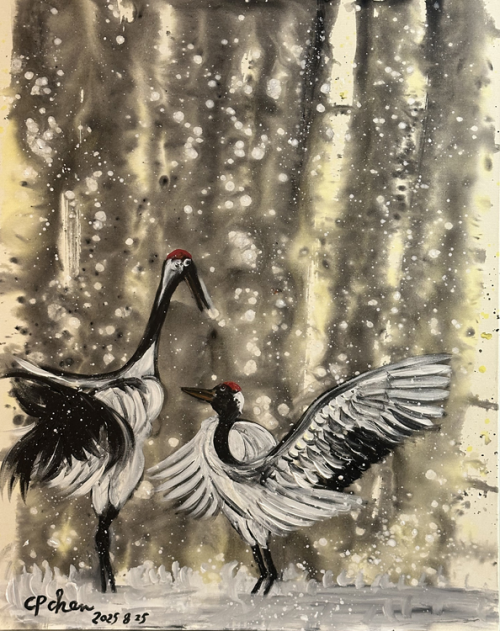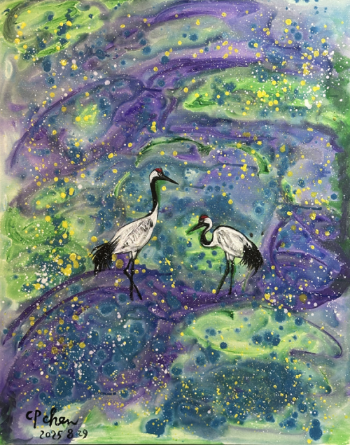 在作品《落花》与《天长地久》中,陈持平进一步探索了动态与静态的平衡,以及情感的温度表达。《落花》描绘桃花树下鸳鸯戏水、落英缤纷的场景,如同草书书写时的连绵笔意,充满韵律感。一对鸳鸯的“悠然”与落花的“纷扬”,一动一静间,营造出春日里生机盎然又不失静谧的氛围。《天长地久》则展现出另一种沉稳的动态美,两只仙鹤姿态挺拔、优雅,水面的绿洲以柔和的绿色铺陈,与仙鹤的洁白形成色彩呼应。整个画面以含蓄的动态与和谐的色彩,诠释出天长地久的隽永意境。